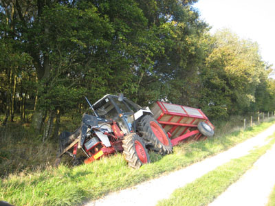 In Greek mythology, Sisyphus was a king who tried to cheat death and the Gods punished him by making him push a rock up a step hill, only to have it roll back down before it got to the top, and he had to repeat the task for all eternity; hence the term "sysyphean". In more modern times you have the painting of the Sydney Harbour Bridge, once you've finished painting you have to start again. Well here at the Curney, we have a combination of the two - keeping the track from the road down to the farm repaired! The track itself is just over 750 yards long, and though "only" the last 250 yards is actually on our land, for all intents and purposes I get to keep it all repaired - the farmer who owns the remaining 500 yards only drives tractor over it and they don't mind pot holes. The original track was constructed out of rock and crushed stone, long before the days of modern farm machinery and cars. Unfortunately it is prone to potholes appearing on a regular basis, and once they appear they rapidly get worse. I've tried various methods of repair, none of which seem to last for very long; you really need a deepish pothole which allows the infill material a chance to bind together when compacted. Unfortunately the deeper the pothole the more jarring and lengthy is the journey down the track! My currently preferred repair technique uses road planings (produced when old road surfaces are dug up and put through a crusher) and then compressed into the pothole using a "wacker". Besides the laborious task and tedium of filling in the potholes (a typical count would be +300), for some reason I've had a "few incidents" while filling in potholes - see photo bottom right below. Unfortunately I don't have a photo of the time I caught the lever which tips the trailer while driving along and dumped half a trailer load of scalpings on the track - where I didn't want them. Even more unfortunately my neighbouring farmer was there to witness the act. |