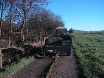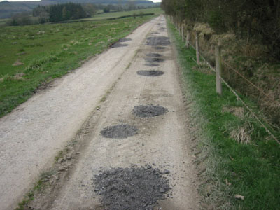 | Early attempt at filing using scalpings and cement - not very successful and expensive. | Latest method using road planning, about half way! | |